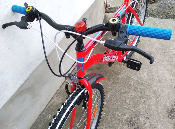 Krásny červený cestný bicykel GOOD BIKE OKLAHOMA. 19" oceľový rám (48), pre výšku postavy: 165 - 178 cm. 26" kolesá, plášte KENDA s bielymi reflexnými pruhmi, rozmery: 26 x 2,10. Počet prevodových stupňov: 3x6 = 18 rýchlostí. Na riadidlách páčkové 3 a 6-stupňové otočné neindexové radenia - SAIGUAN. Predná prehadzovačka - prešmykač: SAIGUAN SG 42T. Zadná prehadzovačka: SAIGUAN. Vpredu aj vzadu V-brzdy: SAIGUAN. Rýchloupínacia sedlovka. Hmotnosť bicykla: približne 15 kg. Odrazky na ráme bicykla aj v kolesách. Držiak na fľašu. Stojan. Zvonček. Plastové blatníky.