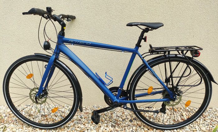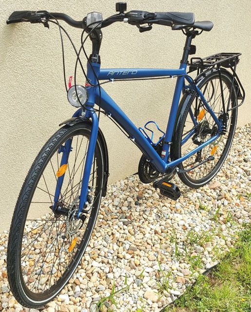 Pánsky cestný trekingový bicykel ANTERO TREKKING. Designed in GERMANY. 21” ľahký hliníkový ALUMINIUM rám, pre výšku postavy nad 178 cm. 28” kolesá z ľahkých zliatin, zpevnené steny, plášte rozmery: 28 x 1 5/8 x 1 3/8. Predné aj zadné rýchloupínacie.